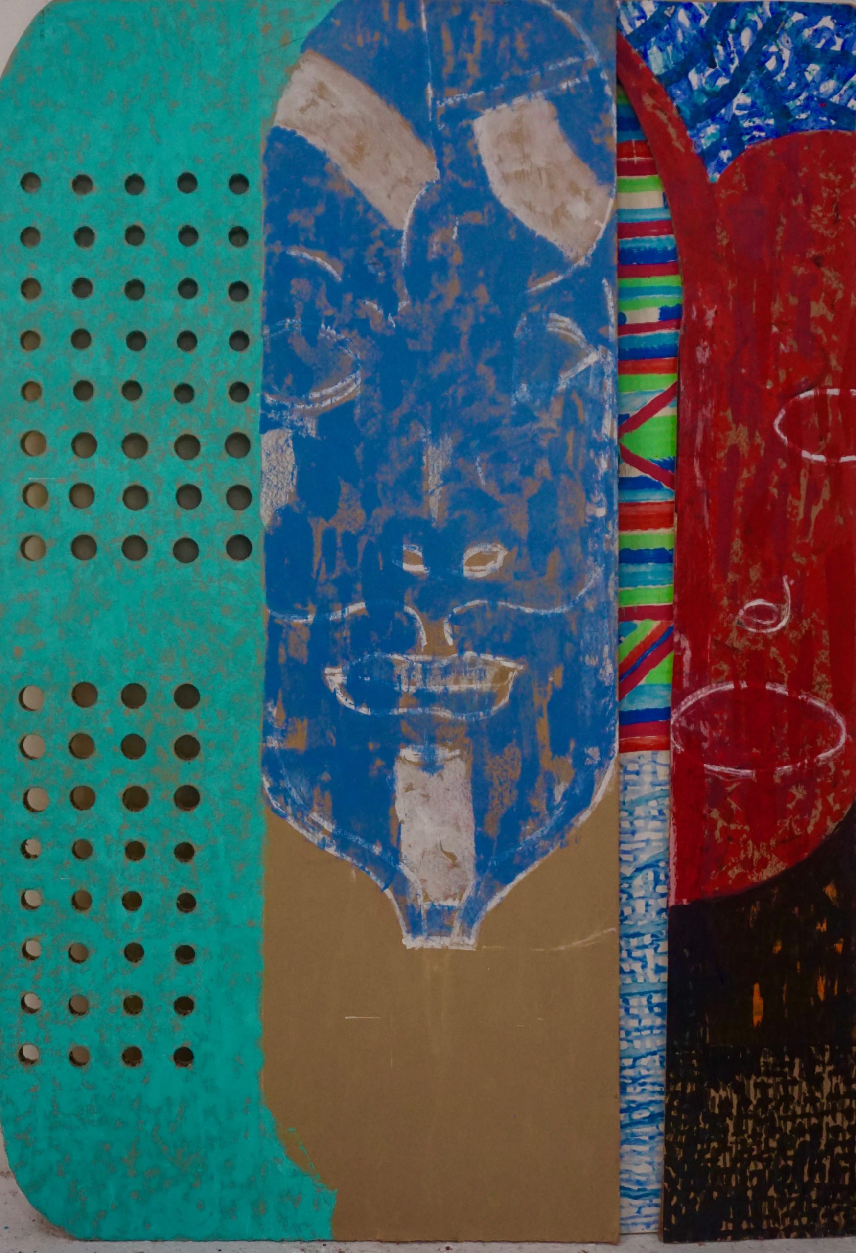 Pour arriver à cet effet, Pierre Antoniucci, utilise des cartons qu’il découpe à sa guise et sur lesquels il colle de grands dessins qu’il complètera en peinture.