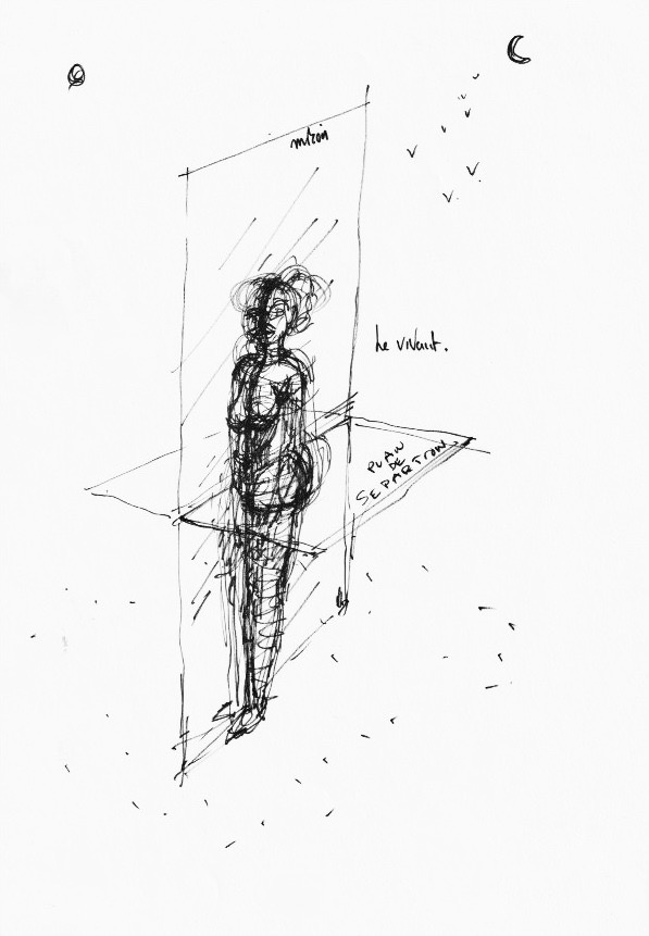 Il existera aussi des plans de séparation en relation avec le corps de l’homme tel celui qui, étant placé horizontalement en son milieu, au niveau du nombril, le décomposera en deux fonctions, sur la partie haute les organes qui permettent la socialisation de l’individu par la communication, le travail ou l’art, avec ses mains, ses bras, ses yeux, sa bouche – La parole — avec les bras, la tête et, sur la partie basse, son indépendance avec ses jambes lui permettant de se déplacer de façon autonome ainsi que diverses autres fonctions importantes tels sont les organes de reproduction.