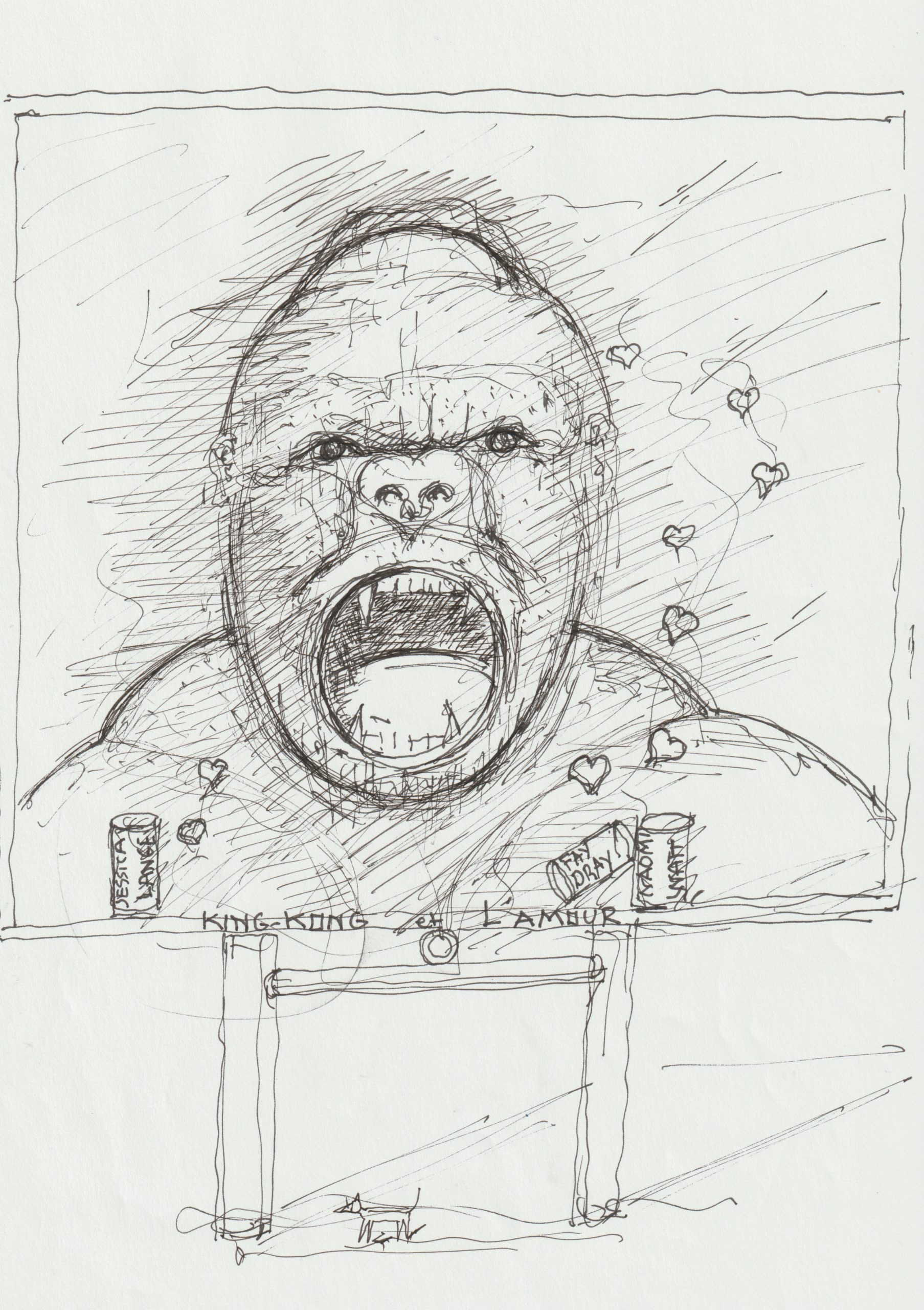 Image de mise en avant, couverture du livre- J’ai fait pour ce livre quelques illustrations dont le dessin de couverture, celui-ci pouvant paraitre étrange mais il illustre un passage du livre dans lequel seront évoqués les actrices ayant tenu les rôles féminins, au cours des époques, dans les films sur King-Kong.